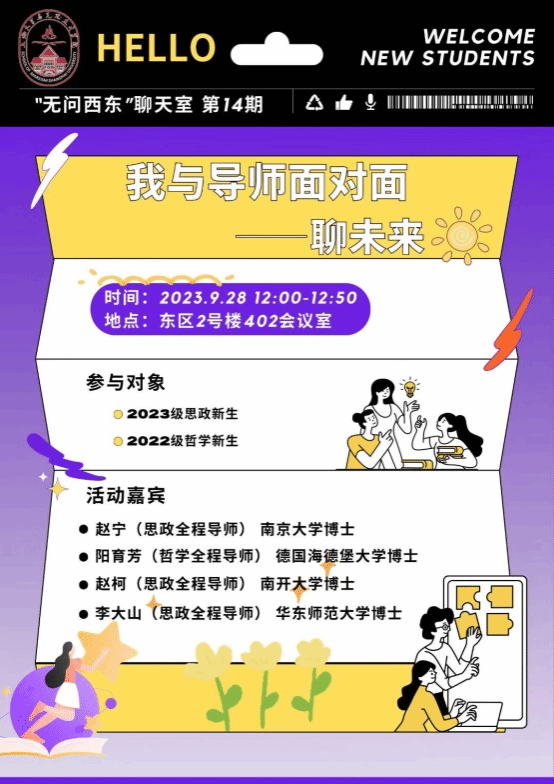 为进一步加强学院本科生全程导师制的实效性,促进新匹配师生之间的交流,为新生同学们做好初期的生涯导航,近期,koko体育官网“无问西东”聊天室第十四期活动在东区2号楼402会议室圆满举行。本次活动的主题为“我与导师面对面——聊未来”,邀请到了赵宁、阳育芳、赵柯和李大山等学院青年教师们作为嘉宾,面向2023级思政新生和2022级哲学新生分享自己的大学生活和成长经历。本次活动由本科生辅导员黄丽娜主持,20余位本科新生代表参与了此次活动。