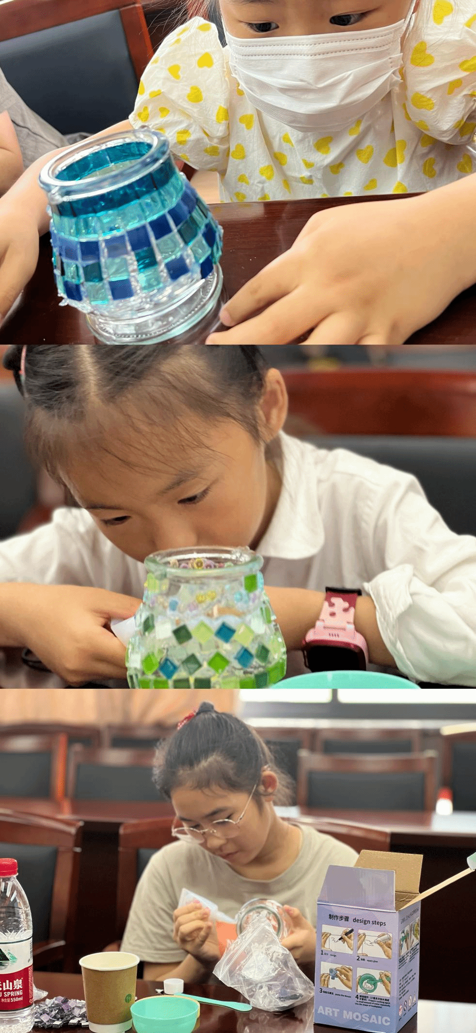 接着,无论是首次尝试的新手,还是已有相关手工经验的能手,小朋友们都用心制作,他们的眼神是那么专注,他们的双手在不停尝试。经过孩子们的精心设计和灵巧拼贴,一块块彩色琉璃小砖就这样一颗颗地贴到了空瓶上。每个孩子都努力要将自己的作品做到最好。 随后,全体小朋友的马赛克灯大功告成了,在点亮的一瞬间,每一盏灯都显得五彩斑斓而又独一无二,每一盏灯都闪耀着孩子们心中最独特的美丽图景和纯真梦想。会议室时不时传出一阵阵欢声笑语,孩子们沉浸在自己动手制作作品的喜悦中,而爸爸妈妈们也似乎再次回到了曾经的纯真童年。 最后,让我们一起欣赏小朋友们的马赛克灯吧。
