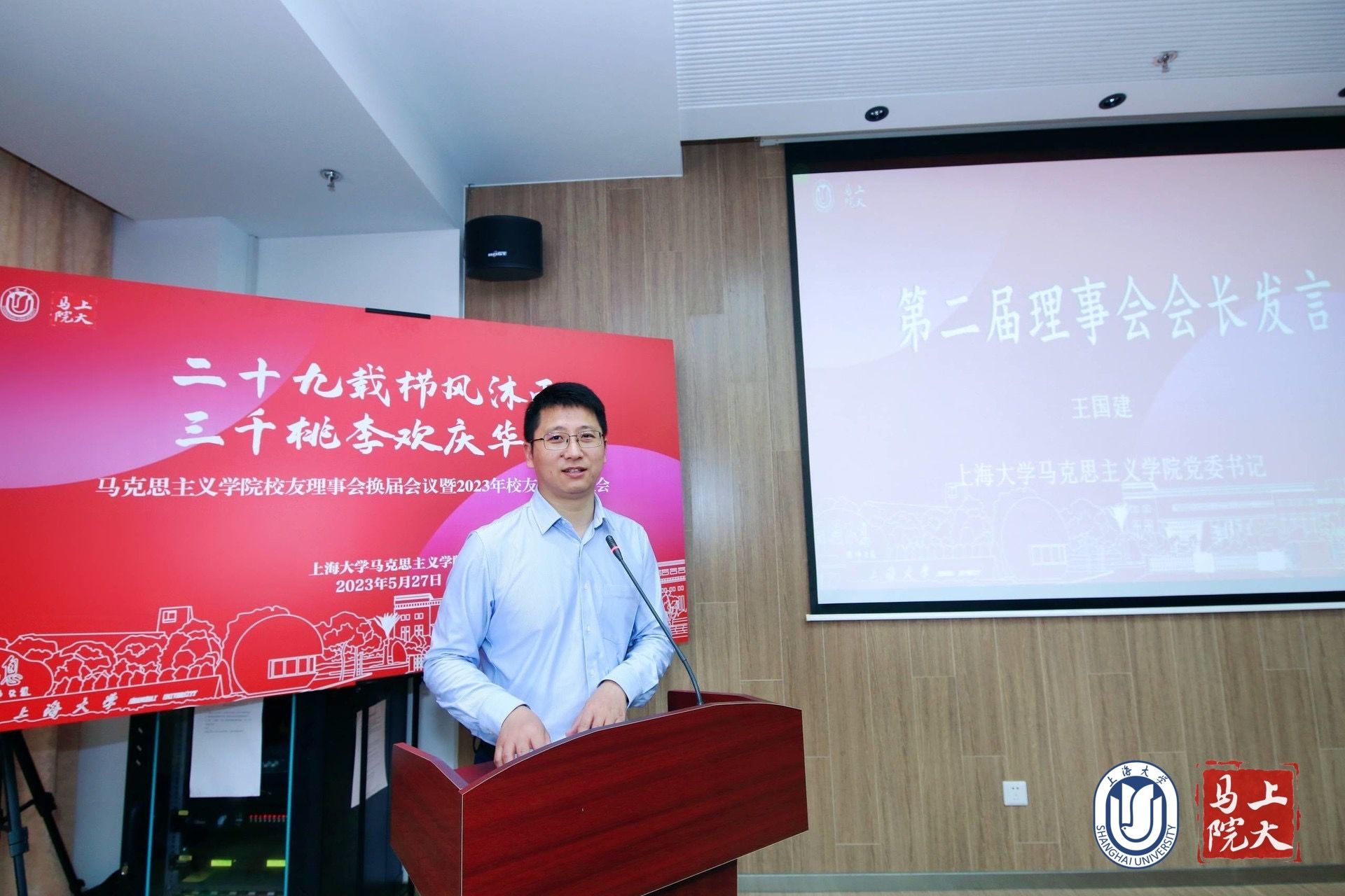 校对外联络处处长、校友会办公室主任陈然为大会致辞。他表示今天以校友会秘书长的身份,向koko体育官网的各位校友致以诚挚的欢迎。他指出学校的发展离不开35万校友的支持,校友对母校的支持是不予余力的,在学校的学科发展、教育教学等方面都做出了突出贡献,他希望能够凝聚校友们的力量,同时也支持校友们的发展,相互之间建立起更多的连接。他还提到koko体育官网在七一勋章获得者李大钊之孙——李宏塔先生的关心支持下,成立守常党支部,赓续了百年上大的红色基因。