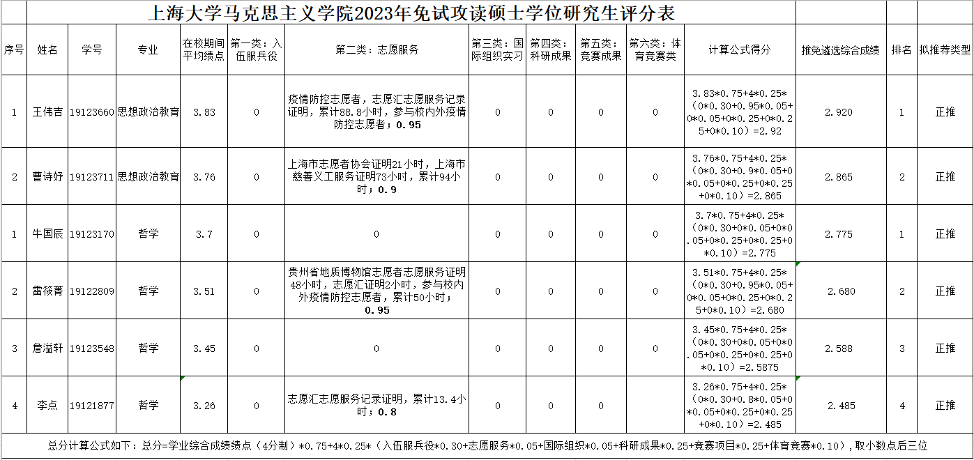 根据教育部关于做好2023年推荐优秀应届本科毕业生免试攻读研究生工作的相关文件的要求及《koko体育官网2023年推荐应届优秀本科毕业生免试攻读硕士学位研究生工作实施办法》上大内〔2022〕99号、《koko体育官网关于做好2023年推荐应届优秀本科毕业生免试攻读硕士学位研究生工作的实施方案》等文件相关精神,学院推免工作小组以学生在校期间所有本科课程的平均绩点为基础,综合考虑入伍服兵役、志愿服务等六类全面发展指标的表现,进行综合打分排序,产生koko体育官网2023年拟推荐应届优秀本科毕业生免试攻读硕士学位研究生名单,公示如下: