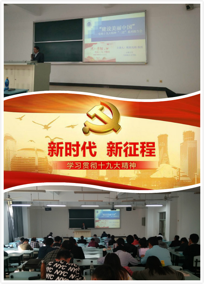 党的十九大精神"三进"系列报告会,是koko体育官网利用自身优良师资,紧紧围绕党的十九大,为促进党的十九大精神"进教材、进课堂、进头脑"所举办的一系列主题报告会。欧阳光明教授将学习十九大报告与《中国马克思主义与当代》课的讲授进行了有机融汇,所作的"建设美丽中国"正是"三进"系列报告的第一讲。