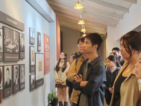 在这里,同学们知晓了杨明斋、李汉俊、俞秀松等人为建团做出的贡献,了解了从外国语学社走出来的一批有志青年,他们如何在艰苦的环境中坚持学习,如何在革命的熔炉中锻炼成长。纪念馆内还特别设置了互动体验区,让同学们更加直观地感受到那个时代的历史背景和社会特点。 在参观过程中,李瑊老师一再提出,让大家感觉一下,亲临历史现场聆听和体验,与在教室听课的别样之处。她说,身临其境,更能体悟到历史的鲜活与丰富,正是在这里,陈独秀与毛泽东进行了历史性的会晤;在这里,革命先辈们庄严宣誓,建立了中国第一个共产党早期组织。这些石库门建筑,承载着中国党史和革命史上的宝贵历史记忆。通过亲身体验,感知历史、触摸历史,使大家更加深刻地体会到了中国共产党的初心和使命。 同学们仔细观看了馆内展陈的许多珍贵的历史照片,聆听了讲解员的详细讲述,仿佛穿越历史时空,与当年的“90”后、“00”后们进行了一次心灵的对话,受到了精神的洗礼。通过一天的学习,大家深有感触,也颇受教益,进一步坚定了为实现中华民族伟大复兴的中国梦而努力学习奋斗的信念。