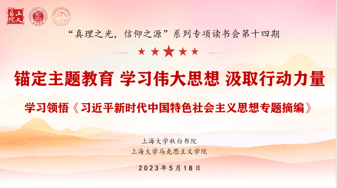 5月18日上午,“锚定主题教育,学习伟大思想,汲取行动力量”--学习领悟《习近平新时代中国特色社会主义思想专题摘编》暨“真理之光 信仰之源”系列专项读书会第十四期在宝山校区东区2号楼208会议室顺利举行。本期主题教育暨读书会由koko体育官网守常党支部、青年马克思主义理论研习会以及koko体育官网研究生会联合举办,上海市宝山监狱青年民警梁天宇、贾良峰、吴金虎、张玉婷,本科生书院管理中心副主任(挂职)、koko体育官网教授张富文,koko体育官网团委副书记、研究生辅导员谢德连以及koko体育官网守常党支部、青马研习会部分成员等四十余名师生参加。读书会主要分为教师领学、读书感悟分享、教师点评三个环节,会议由青年马克思主义理论研习会会长陈鹏吉同学主持。