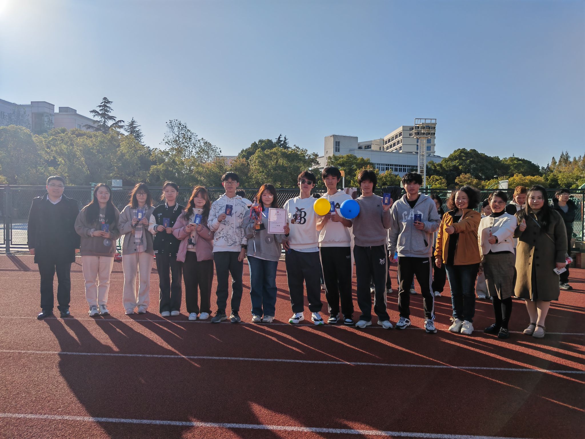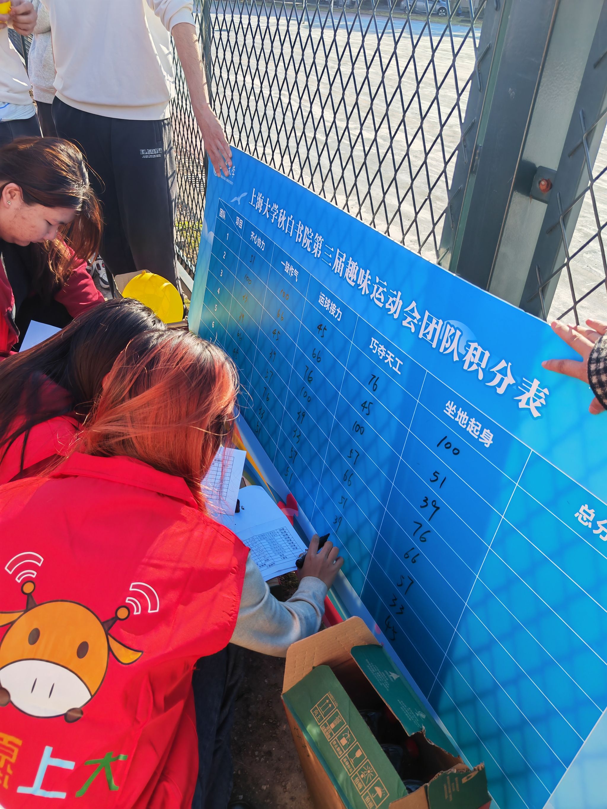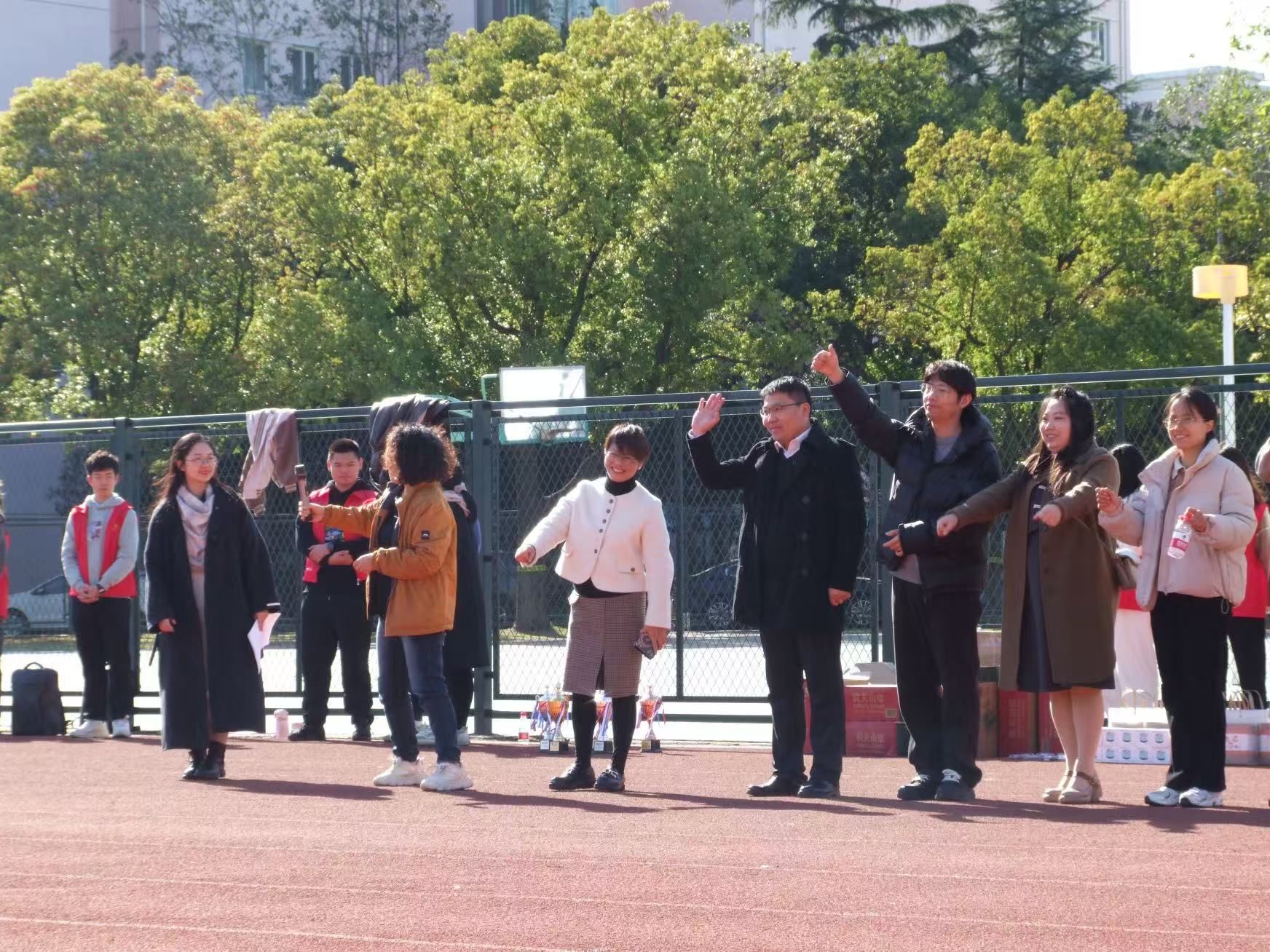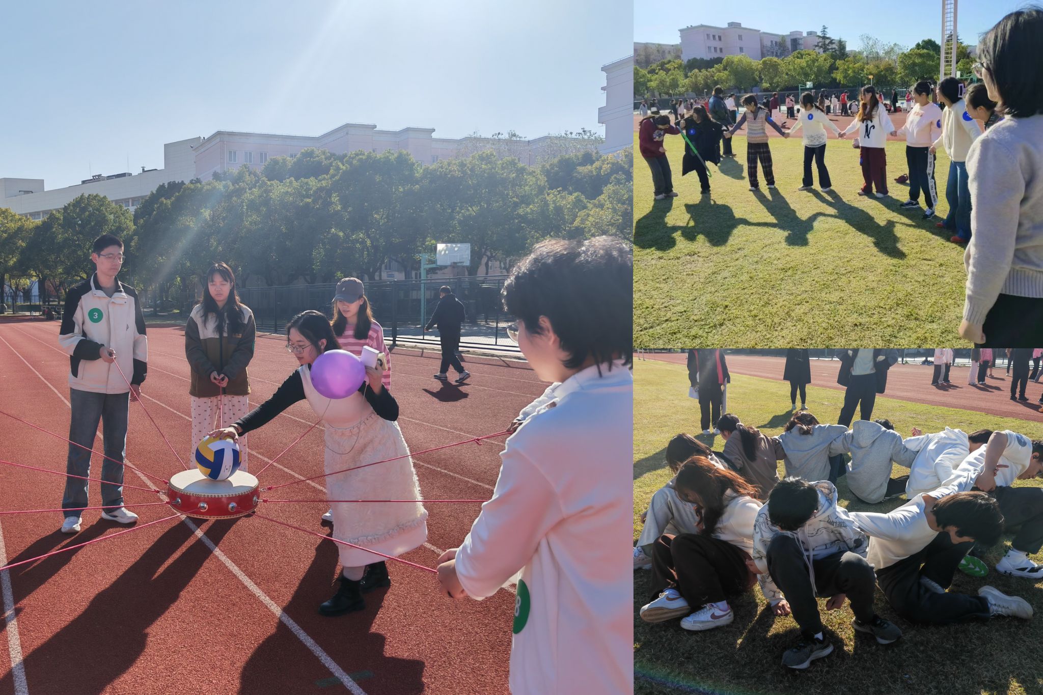 在志愿者带领下,秋白师生在绿茵场完成热身,随即投入热烈的比赛项目。一时间,加油呐喊声、欢声笑语声在阳光里此起彼伏。原来“陌生”的队伍在“齐心协力”的双手交握中、“一鼓作气”的方向指挥中、“运球接力”的同频共进中、“巧夺天工”的击掌接力中、“坐地起身”的团队协作中融合成了暖洋洋的一片。 一句句“1,2,3”,一声声发自内心的大笑与“加油”的高呼,将队列变成了队伍。领导、老师、同学们都在此刻团结成了可靠的“队友”们。