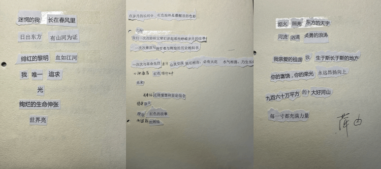 在充满趣味性和互动性的红色拼贴诗歌会环节,同学们积极参与,用手中的纸片拼凑出一首首充满激情与创意的诗歌,这些诗歌不仅表达了对革命先烈的敬仰,也反映了青年学生对国家和民族未来的深刻思考。