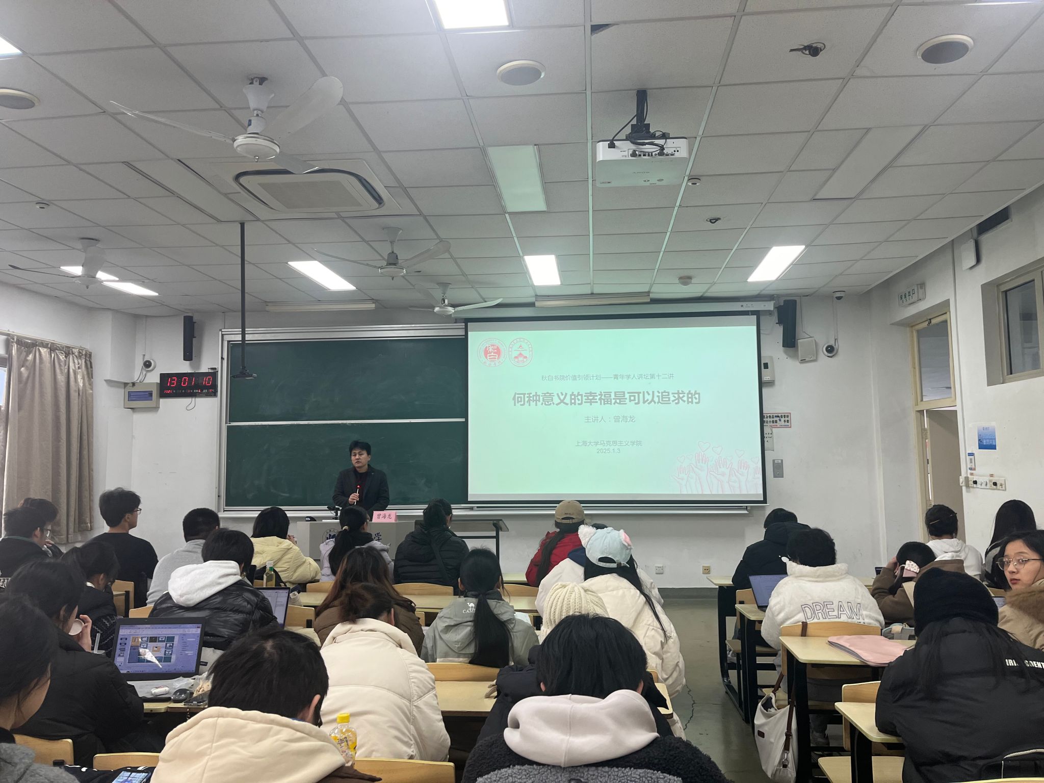2025年1月3日下午,秋白书院“青年学人讲坛第十二讲”之“何种意义的幸福是可以追求的?”讲座于宝山校区AJ104顺利举办。活动由koko体育官网承办,koko体育官网哲学系副教授曾海龙老师主讲,学院学生会文体部部长柳煜龙主持。秋白书院百余名学生参加,现场氛围热烈。 曾海龙老师从幸福的定义谈起,他表示,以往人们对幸福的定义是很复杂的,现在对幸福的定义是快乐,满足或成就感,等等。基于以上种种对“幸福”定义的探讨,曾老师开始分享他对主题“何种意义的幸福是可以追求的?”的思考。
