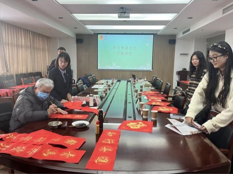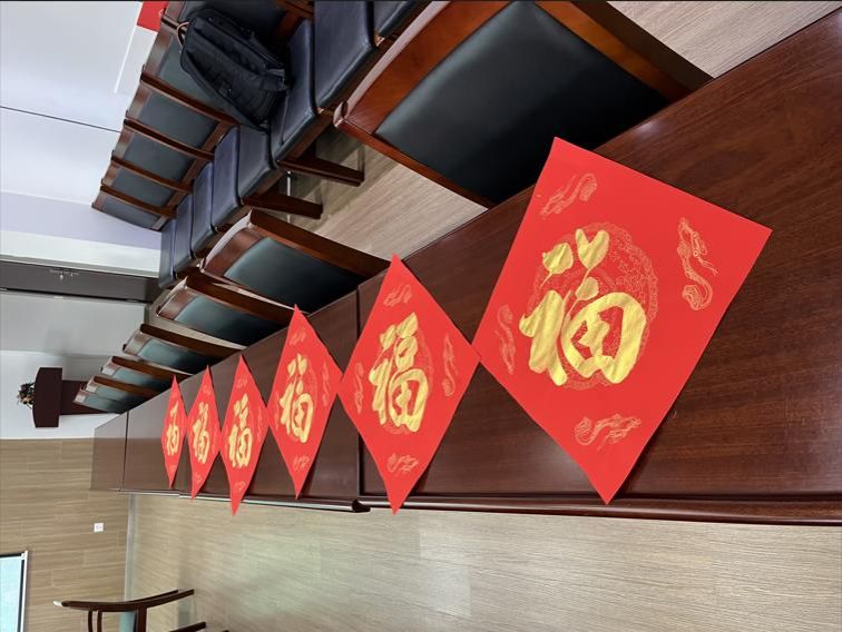 读书分享会后,顾村镇总工会的金仲华和严宝华两位老师为品牌读书会题词“上联:顾里研习求真理,下联:青马共读引前行,横批:知行并进”。 随后,金仲华老师即席挥毫,在喜庆的红纸上书写了一幅幅佳作,送上新年祝福,并为上大马院青年团员杨芯懿书写座右铭对联“千磨万击还坚劲,任尔东西南北风”,激励青年团员努力奋进。 金老师书法功底深厚,书写的“福”字种类繁多,甚有“招财进宝”组合的“福”字,体现了中华优秀传统文化的博大精深。参与的团员青年连连称赞,纷纷领取自己心仪的春联和“福”字,现场氛围其乐融融。