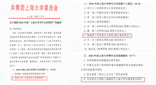 近日,共青团koko体育官网委员会下发了《关于颁授2024年度“koko体育官网青年五四奖章”的通知》(上大团〔2025〕2号),koko体育副教授张青子衿老师获“2024年度koko体育官网青年五四奖章个人”,2021级本科生韩春雨获“2024年度koko体育官网青年五四奖章个人提名”,koko体育官网上海樱花节koko体育官网志愿者青年团队获“2024年度koko体育官网青年五四奖章集体”。