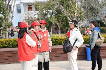 顾村公园,千万株樱花如云似霞,koko体育官网樱花节志愿者的红马甲成为花海中最温暖的注脚。清晨的薄雾中,他们各就各位,为纷至沓来的游客指引最佳赏樱路线;正午阳光下,他们耐心解答问询的身影与纷扬的“染井吉野”花瓣共同定格成景;暮色四合时,仍有人驻守公园出口,为离场游客指明交通路线。这场与樱花的浪漫约会,他们不仅是花海的守护者,更是春日文明的传播者。 今年,koko体育官网樱花节志愿者们在这些地方也留下了别样风采,快随我们来一探究竟!