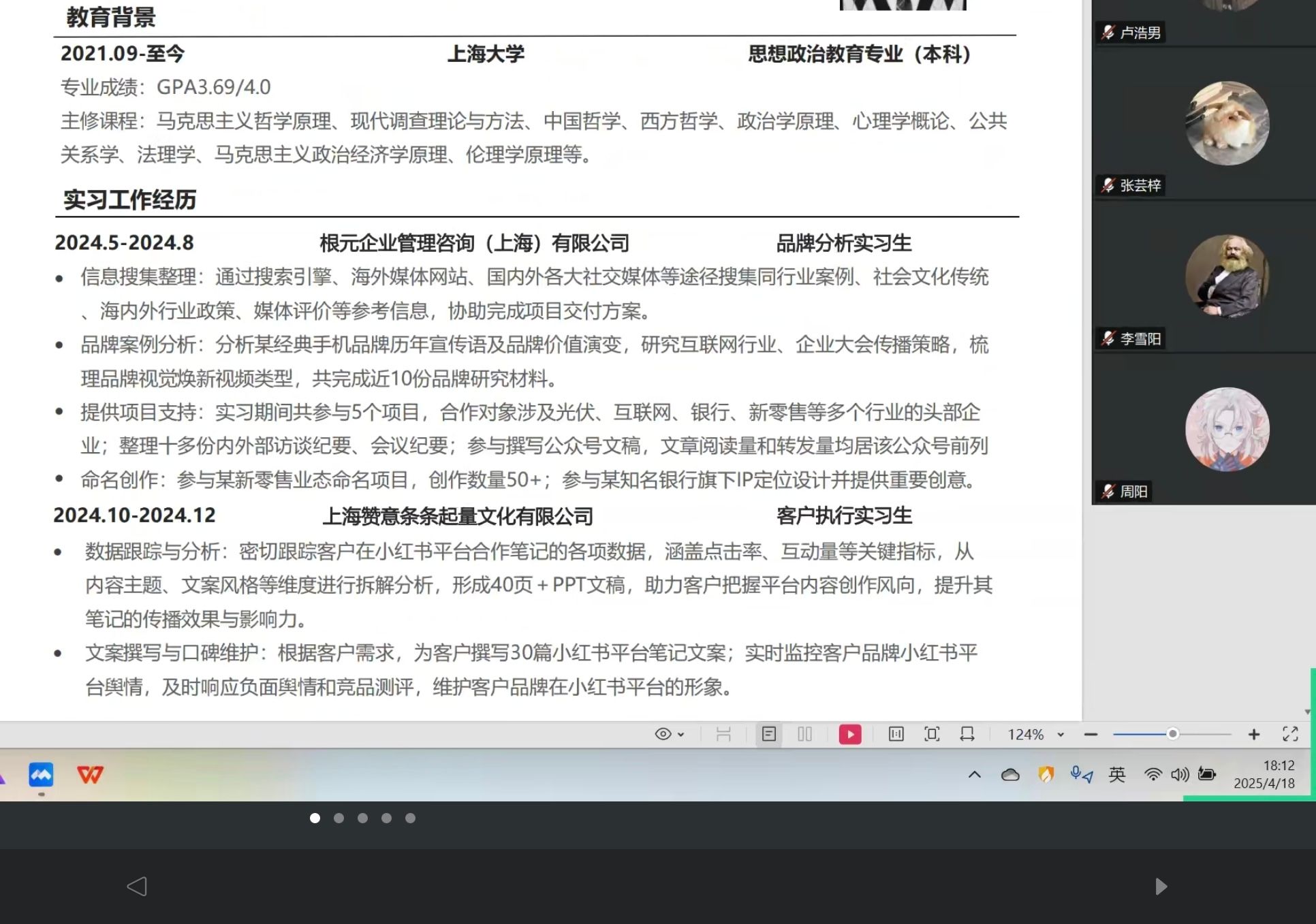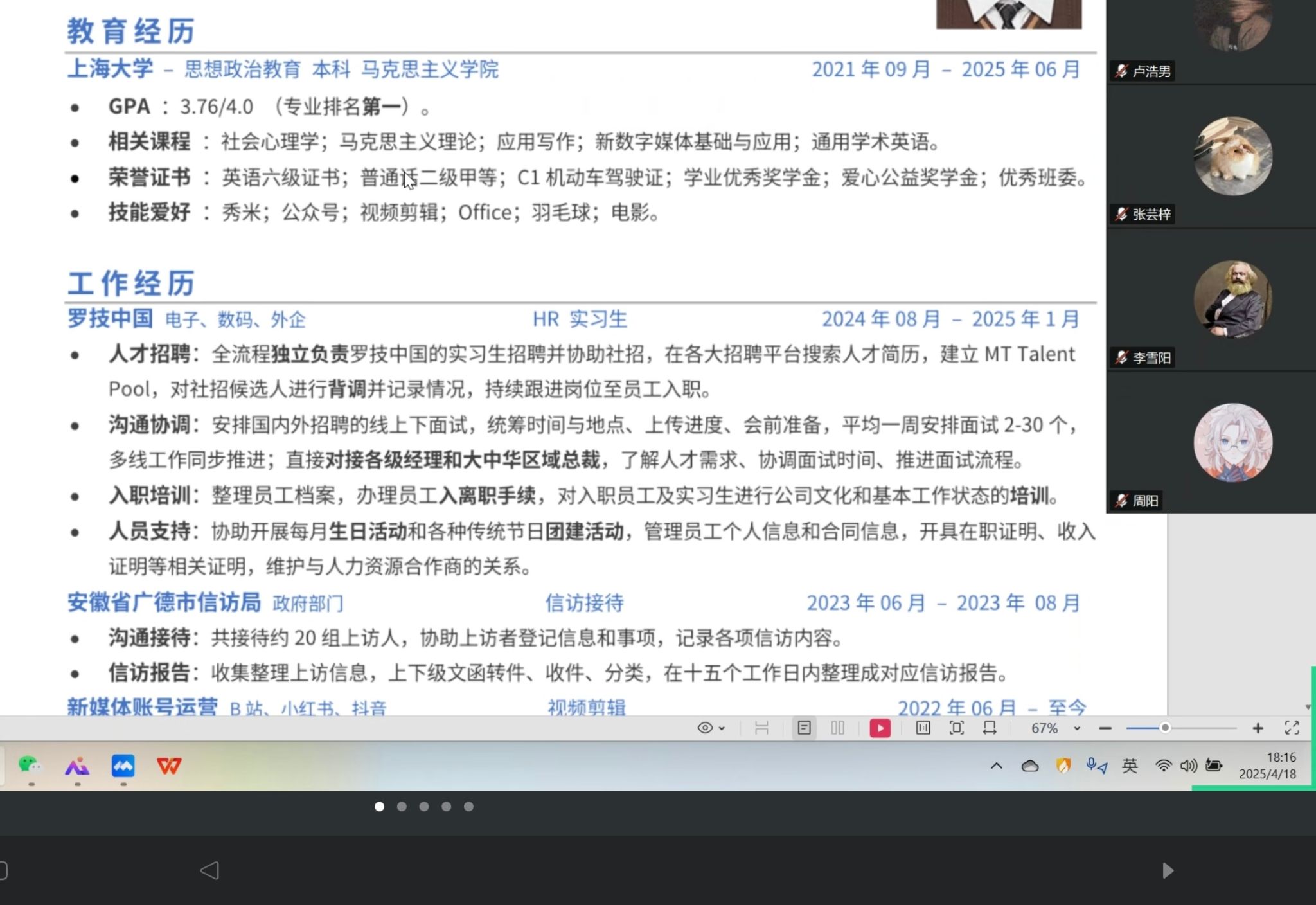 分享会上,朱启银先以自己及毕业班其他几位同学王亚蕾、孙叶枝和王慧洁的简历为样例,逐一详细讲解了简历制作的要点。她认为简历证件照需干净整洁大方,女生可化淡妆提升精神面貌,男生则应理发并着正装;简历呈现的校内外实习实践经历要与岗位需求有一定的适配度,若实习经历较少,可着重描述自己在实习中的具体工作内容,优先选择知名企业的实习经历,并用“独立负责”等表述突出个人能力;在校园经历方面,注重量化成果,同时可将论文、项目等成果纳入其中,增强简历竞争力。此外,在面试环节,她强调,求职学生要做好求职企业的背调,在现场则应充分展现对公司岗位的认可态度,并且主动突出自身与岗位的契合度。