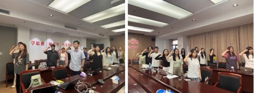 四、誓言铿锵砥砺前行 “我志愿加入中国共产党……”在研究生第三党支部书记王卓曲的领誓下,全体党员面向党旗庄严宣誓。铿锵有力的誓言在会场回荡,彰显着马院学子永远跟党走的坚定信念。