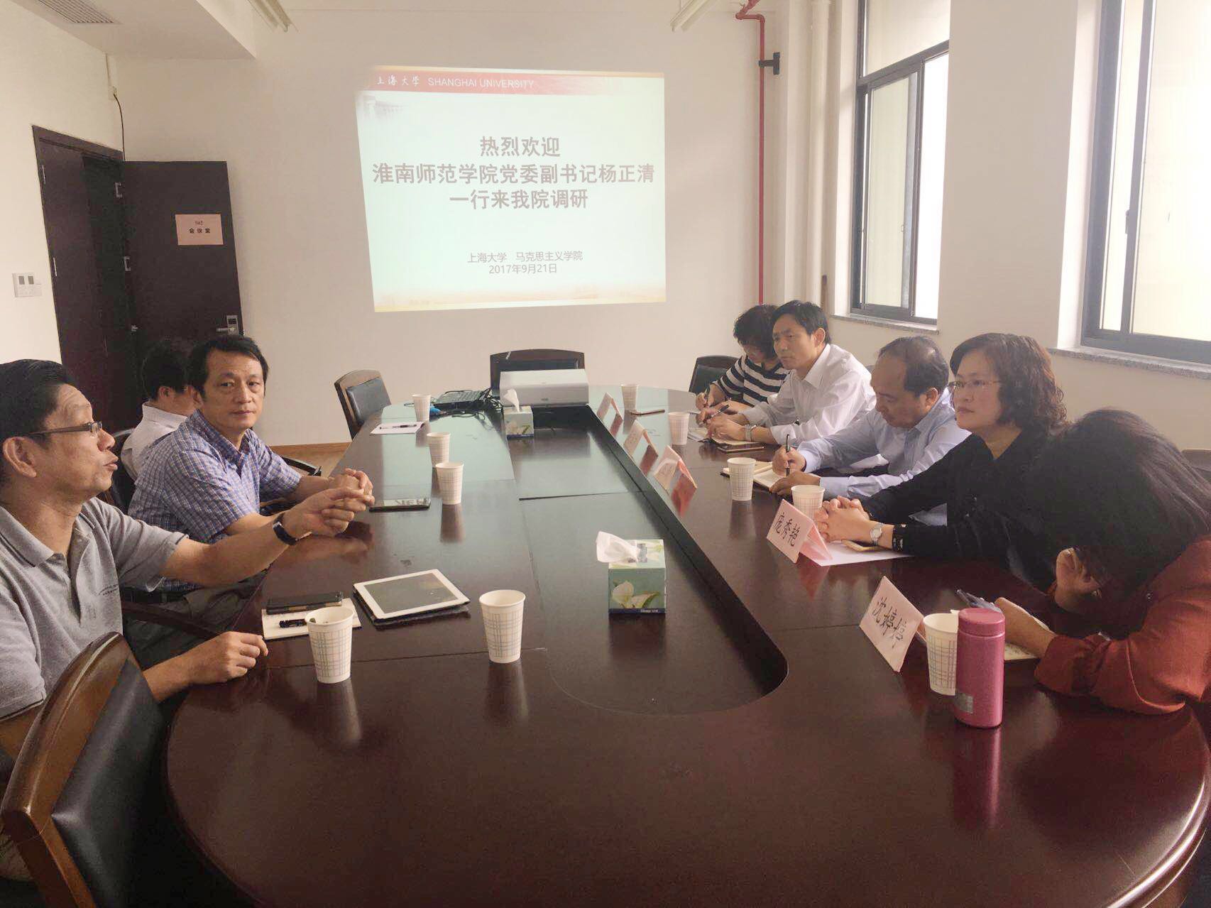 2017年9月21日上午,淮南师范学院党委副书记杨正清、koko体育官网院长吴玉才以及随行优秀教师程芳云、庞秀艳、沈婷婷一行来访调研。koko体育官网院长欧阳光明、副院长邱仁富、马克思主义基本原理教研部焦成焕、思想政治教育教研部奚建群、马克思主义中国化教研部申小翠出席本次来访调研。