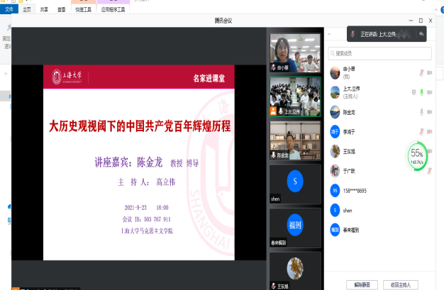 本次讲座的主题为《大历史观视域下的中国共产党百年辉煌历程》,陈教授从中国共产党的创立、中国共产党历史的主题主线、评价中国共产党的历史的视野和中国共产党为什么“能”?四个方面展开,穿梭在微观史实与宏观探讨之间,令人深思。在讲述党的创立的这一部分中,陈教授追求历史事实的准确性,参考历史人物日记、游记等等在内的很多历史资料考证中共一大的时间、中国共产党的第一个纲领的诞生,活灵活现地展现了早期党组织中各人之间的关系以及早期党的创始人由于个人对于党的认识的不同,结局有人令人唏嘘、有人令人敬佩,发人深省。在第二部分,陈教授引用习近平总书记在党史学习教育大会上的讲话来表达中国共产党历史的主题主线:“一百年来,中国共产党团结带领中国人民进行的一切奋斗、一切牺牲、一切创造,归结起来就是一个主题:实现中华民族伟大复兴。”并以大事和主线的形式来表述中国共产党的历史解开了十九大以来奠定在更为坚实的物质基础之上的开辟中国特色社会主义、全面建成小康社会中国共产党百年历史的新叙事。接下来,陈教授用新的历史框架和维度为我们展现了如何评价中国共产党的历史视野的问题,提出了从置于中华民族发展史、中国近现代发展史、世界社会主义发展史和人类文明发展史四个维度来评价的角度,将历史和现实相结合、将国内和国际相结合,更为完整和准确,令人信服。在讲授最后一部分“中国共产党为什么‘能’”时,陈教授以问题为导向,从现实情境出发,深刻分析了中国共产党之所以能成为世界上党员人数最多的政党、执政能力最长的政党、执政能力最强的政党和人民满意度最高的政党背后的原因是:马克思主义理论指导、党中央的集中统一领导、人民的拥护和支持、道路选择的正确性、中国共产党的精神支撑和中华优秀传统文化,从以人为本的执政理念到大一统的文化精神内核,揭示了中国与社会主义互相融合的奥秘,为我们展示了百年大党引领中国走上独立富强自主道路的光辉历程。