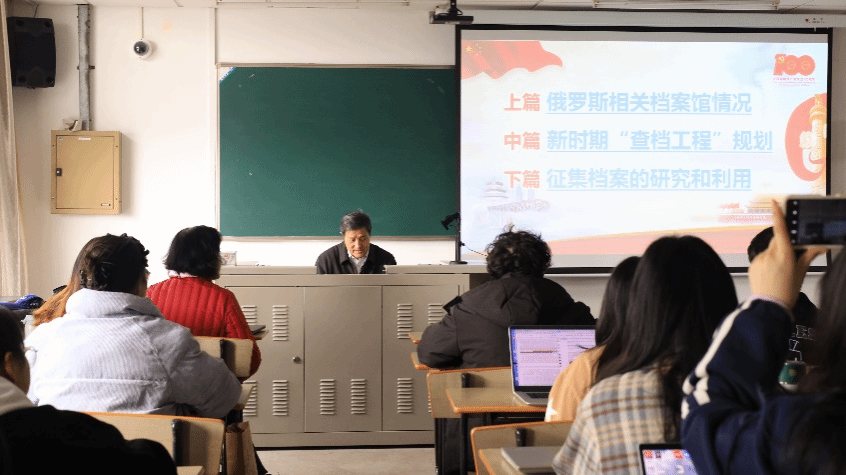 曹耘山老师“查档”第一站是俄罗斯国家社会政治历史档案馆(原共产国际档案馆),此馆保存着一大批有关我党老一辈革命家的历史资料。在十余年的查档过程中,从俄罗斯国家社会政治历史档案馆到俄罗斯国家近代史档案馆,曹老师及其团队查找复制了600多份个人档案,例如李大钊、陈潭秋、何书衡等先驱英烈;毛泽东、李季等开国元勋;陈独秀、朱务善等党史人物。除文字档案外,他还展示了许多从俄罗斯国家电影和图片资料档案馆和俄罗斯录音档案馆发现的珍贵图片档案和影视录音资料,包括1924年东方大学和青年共产国际四大的影像资料;1949年毛主席抵达莫斯科火车站的演讲录音;1949年12月苏联远东军事法庭对12名日军细菌战犯的审讯录音等极其珍贵的历史档案。这些珍贵的图片、录音和录像资料,跨越时空的界限,真实且生动地再现了若干年前的历史事实,使同学们身临其境,颇受震撼。 曹耘山老师对“查档工程”充满着热情和坚守,他定下在共产国际档案中找寻到200位先驱英烈档案的目标,如今200人的目标已经完成了160余人,后续团队将会继续努力。他进一步与师生分享三点体会:首先是历史传承的重要性,通过对历史资料的深挖和研究,继承和发扬中国革命的传统和精神;其次是实事求是的学术态度,即在研究中坚持真实、客观的原则,尊重历史事实;最后是国际视野的重要性,曹老师通过“查档工程”展示了中国革命历史与国际共产主义运动的紧密联系,强调了开展国际合作与交流的重要性。