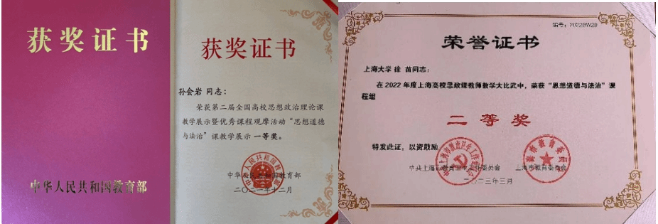 二、“思想道德与法治”课程教学底蕴深厚、特色鲜明 依托思想政治教育专业本科、硕士、博士一体化培养模式,历史底蕴悠久,特色鲜明,不断解放思想,创新改革。通过引入案例教学、情景模拟、小组讨论等多样化的教学方法,激发学生的学习兴趣和积极性。同时,注重运用现代信息技术手段,如在线课程、虚拟实验室等,提高教学效果。陆续参与了大学生讲思政课、思政课微视频等一系列活动,团队教师作为指导老师所指导的学生作品,在上海市获得了多项奖励。五年来,围绕着核心课程“思想道德与法治”的建设,与其他教研部共同推进思想政治理论课实践(1)、劳动理论教育课程等思政课程,在改革创新课程建设、提质培优师资队伍建设方面,做出了诸多努力,并初见成效。2020年,陶倩教授领衔“高校思政课发挥新时代爱国主义教育主阵地作用研究”获教育部高校思想政治理论课教师研究专项重大课题攻关项目立项;2021年,孙会岩副教授荣获全国高校思政课教师教学展示活动一等奖;2022年青年教师徐苗获得上海市高校思政课教师教学大比武二等奖等。