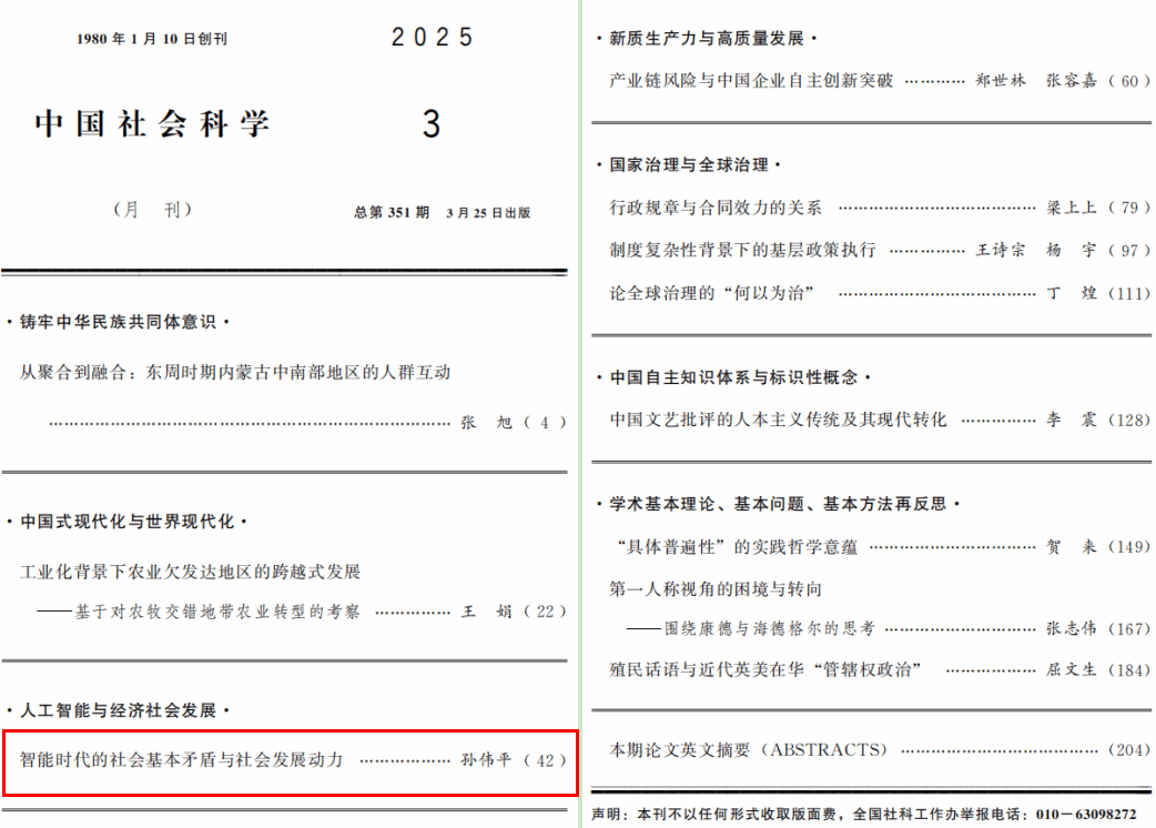 近日,koko体育官网孙伟平教授在《中国社会科学》(2025年第3期)发表理论文章,题目为《智能时代的社会基本矛盾与社会发展动力》。 文章指出:“人工智能作为一种革命性、颠覆性的高新技术,正在快速发展并广泛应用于经济、社会各个领域,掀起了一场空前的产业革命和社会变革,彻底改造、重塑了整个社会的基本面貌和形态。智能生产力的快速创新发展,驱动新型技术社会形态——智能社会——加速成型,但建基于工业社会的资本主义生产关系日益落后于智能生产力的发展水平,并进一步导致上层建筑体系越来越不适应经济基础的发展状况,反过来又严重地阻碍了智能生产力和智能社会的发展。解决智能时代的社会基本矛盾,需要在大力发展智能生产力的基础上,建立新型生产关系使之适应智能生产力的发展水平,变革上层建筑使之适应经济基础的发展状况,从而将智能社会的社会基本矛盾转化为强大的社会发展动力,推动智能社会的发展走上‘快车道’,为新型的经济社会形态——共产主义社会——的到来奠定基础、创造条件。”