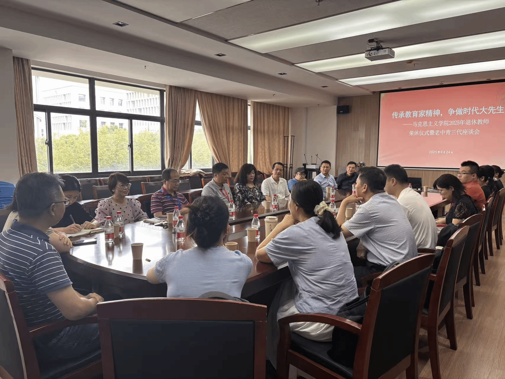 仪式最后,王国建和叶海涛共同为欧阳光明、张丹华、彭学农三位教师颁发荣休纪念品及鲜花。全场以热烈掌声向荣休教师致以崇高敬意和美好祝福。座谈会在温馨、奋进的氛围中圆满结束。