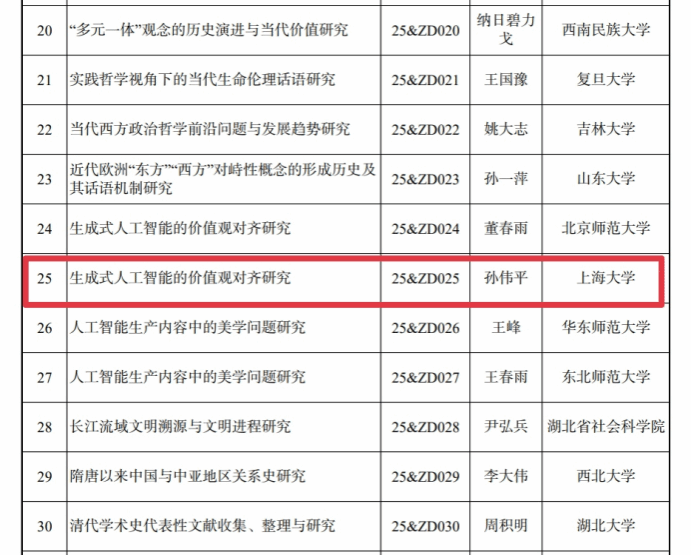 2025年12月19日,全国哲学社会科学工作办公室公布2025年国家社科基金重大项目立项名单。koko体育官网孙伟平教授主持的《生成式人工智能的价值观对齐研究》(25&ZD025)获批国家社科基金重大项目立项!
