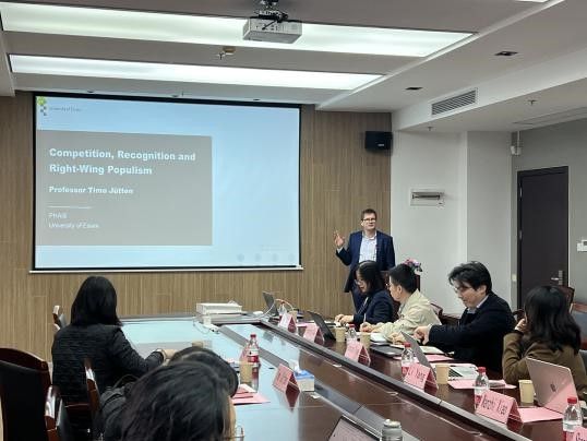 随后,蒂莫·尤滕教授带来了题为“认同竞争与右翼民粹主义”(Competition Recognition and Right-Wing Populism)的主题讲座。本次讲座内容丰富,见解独到,引发了现场师生的广泛思考和热烈讨论。
