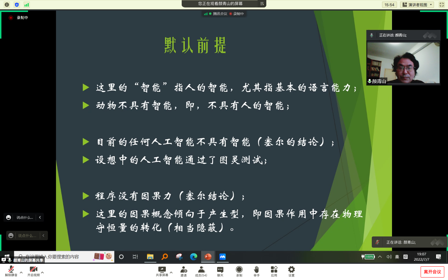 2022年7月7日晚七点整,由koko体育官网与智能社会与文化研究院主办的智能社会与文化高端论坛第六期顺利举行。本次论坛邀请华东师范大学哲学系颜青山教授以“智能的习得性条件”为题作学术报告;koko体育官网哲学系刘小涛教授担任主持人,苏州大学谭力扬副教授和koko体育官网戴益斌副教授作评论人。50余位师生参与了本次论坛。